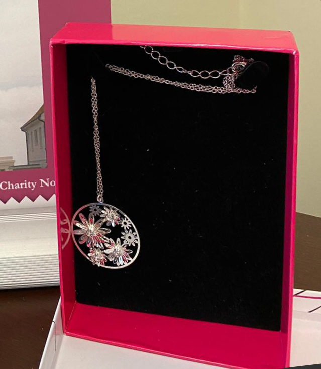 - A silver coloured, floral pendant necklace, kindly donated by Nathan and Sonia Clews